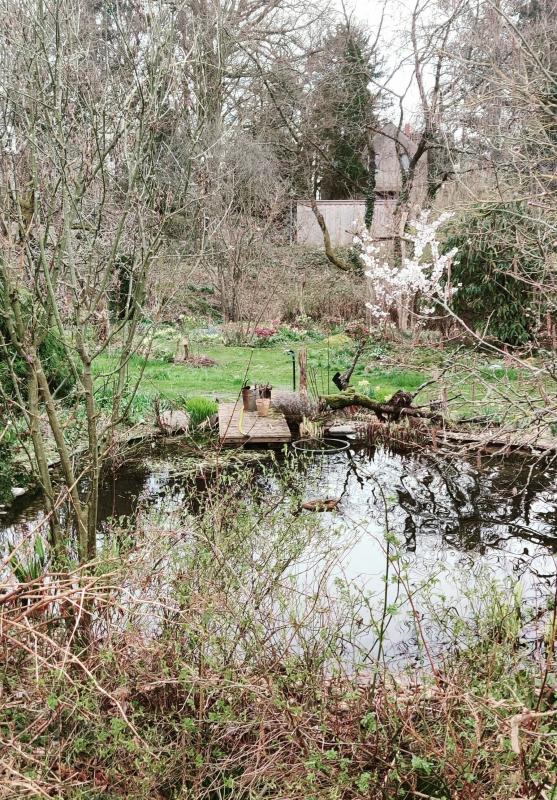 Der endet aktuell auf einen Gesträuch aus 'Blush Hip', Rosa multiflora und Polygonum 'Johanniswolke'. Das wird natürlich noch entfernt. Dann geht der Blick über den Teich zu Prunus yedoensis und Halesia caroliniana. Ich habe davon gerade nur ein schlechtes Handyfoto zur Hand.