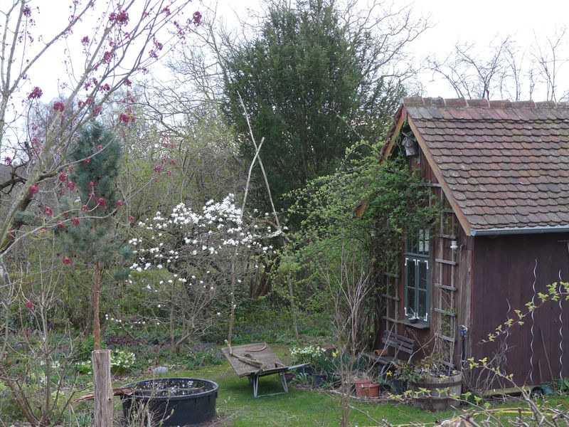 Am unteren Ende der Blick hinüber in den alten Garten. Vor dem Gartenhaus ist 'Christine Helene' einem Wasserbecken gewichen.