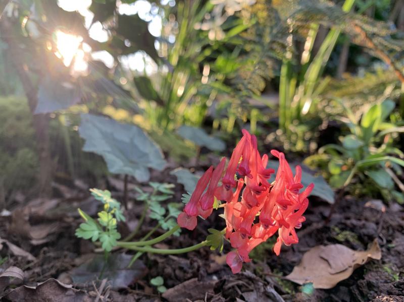 Sämling von Corydalis 'GP Baker' im Abendlicht. Kaum Laub, reichlich Blüte 😂