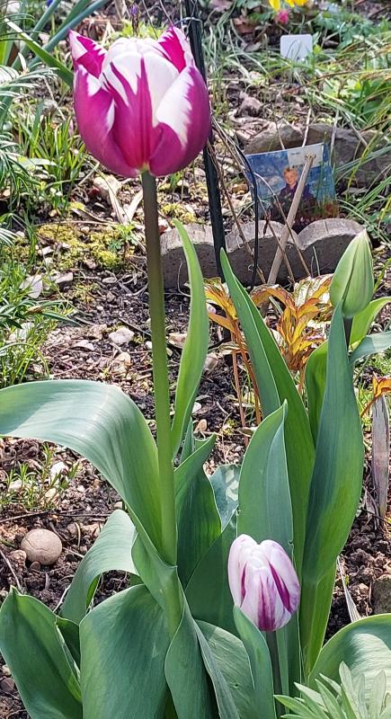 Ins Tulpenbeet mit den später blühenden Tulpen hat sich eine einzelne Weinbergstulpe eingeschlichen und blüht nun dort „allein auf weiter Flur“ 😁