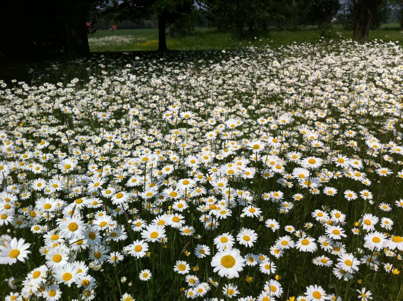 Auf dem angehängten Foto sieht man unsere Wiese in 2012, in dem Jahr sind wir hier angekommen. Damals war die Obstwiese übersät mit Margeriten. Es war ein wundervoller Anblick im späten Frühjahr.