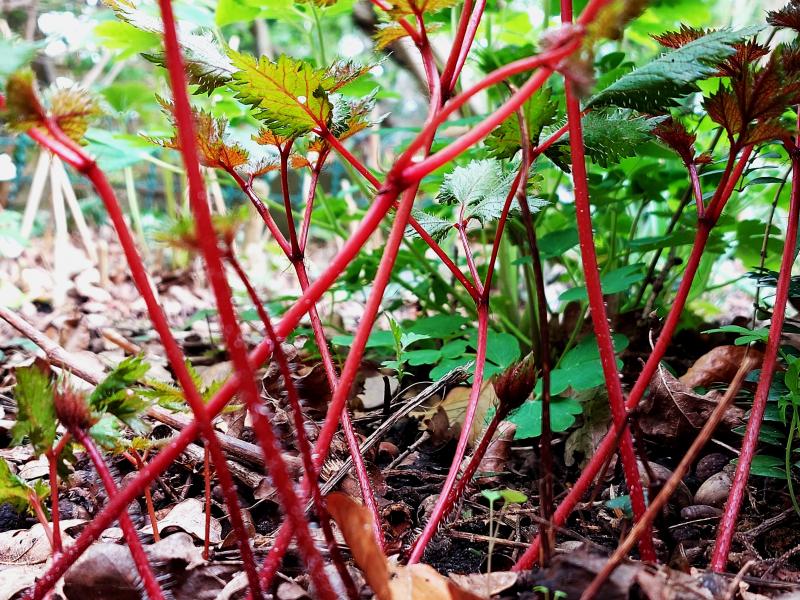 Bei den Farnen ist Polystichum polyblepharum hier am weitesten im Austrieb