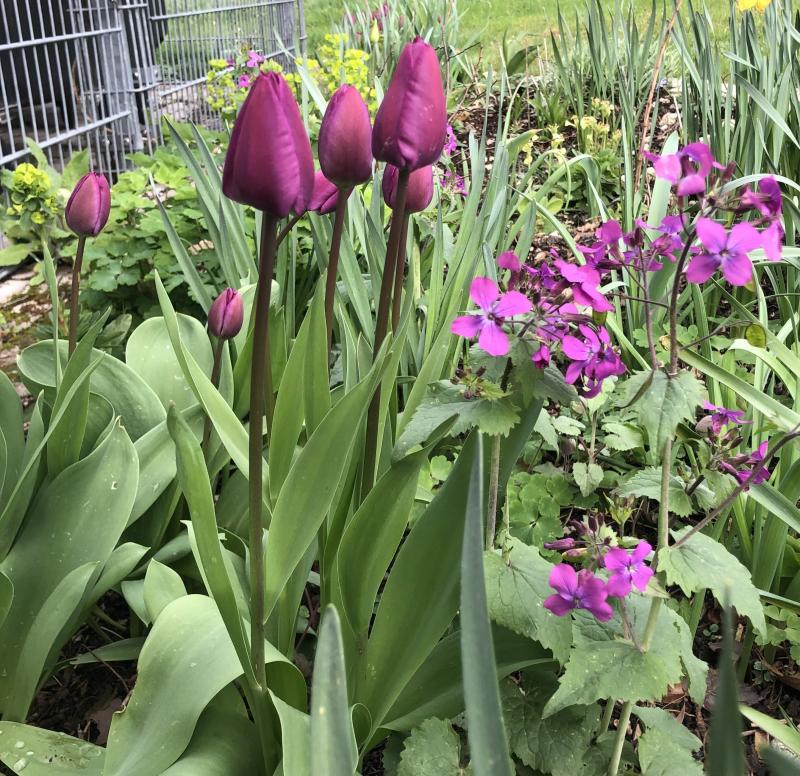 Hier eine unglückliche Kombi. Im Vordergrund Salmon Impression, Darwin, sehr hoch. Im Hintergrund niedrige Triumph Tulpen Synaeda Amor und Continental