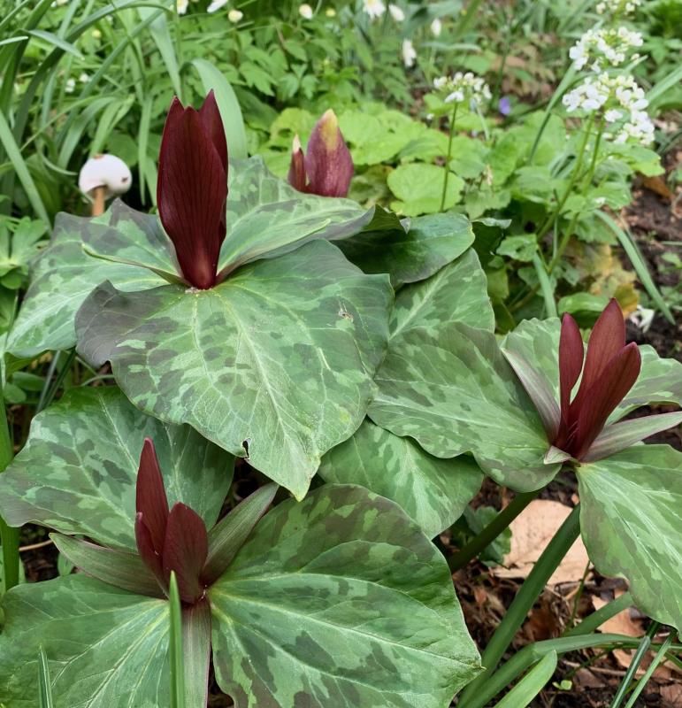 Hier blühen inzwischen Trillium kurabayashii in verschiedenen Farbtönen.
