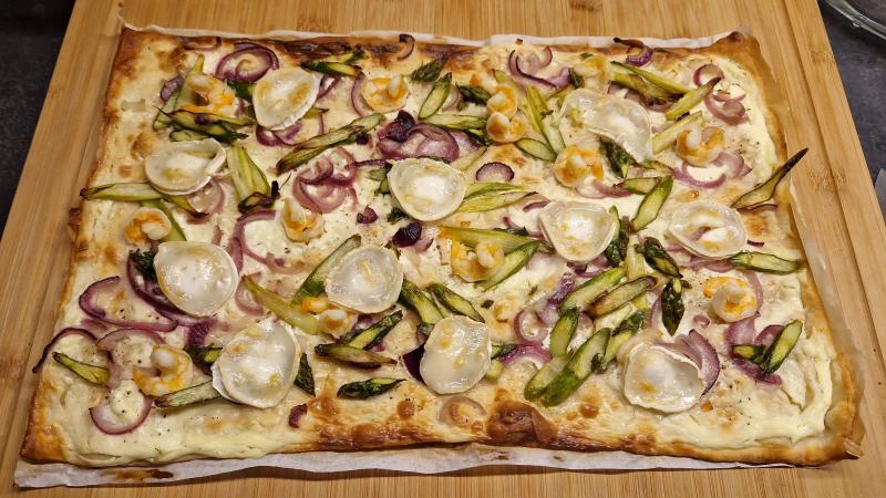 Gestern gab´s Flammkuchen mit grünem Spargel, Garnelen und Ziegenkäse.