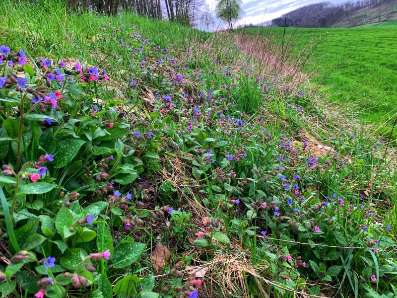 Massenbestand von Pulmonaria officinalis gut 200 m langer 3 m langer Streifen voll mit Lungenkraut unglaublich wie das gesummt hat