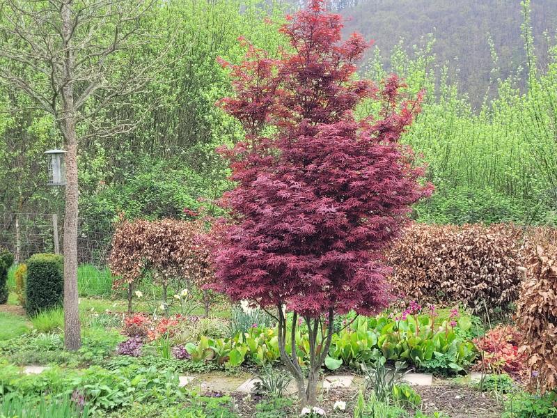 Bei 'Dissectum Garnet' bewundere ich immer noch, wie aus einer Knospe ein kompletter Zweig mit zahlreichen Blättern wächst. Hier nochmal das Bild von vor ein paar Tagen und eine Aufnahme von heute: