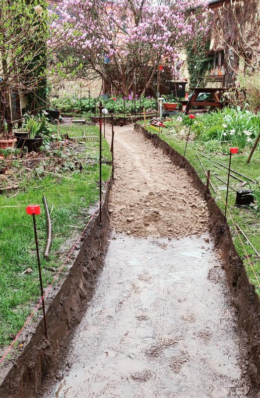 Erkenntnis zum Feierabend: Der Mitarbeiter des Baustoffhandels dürfte einen falschen Faktor für die Umrechnung von Kubikmetern in Tonnen verwendet haben. Trotzdem wir schon Material für noch zu pflasternde Flächen eingeplant haben, liegt da jetzt viel zu viel Zeug. Nun ja, müssen halt noch ein paar Projekte her. ;D