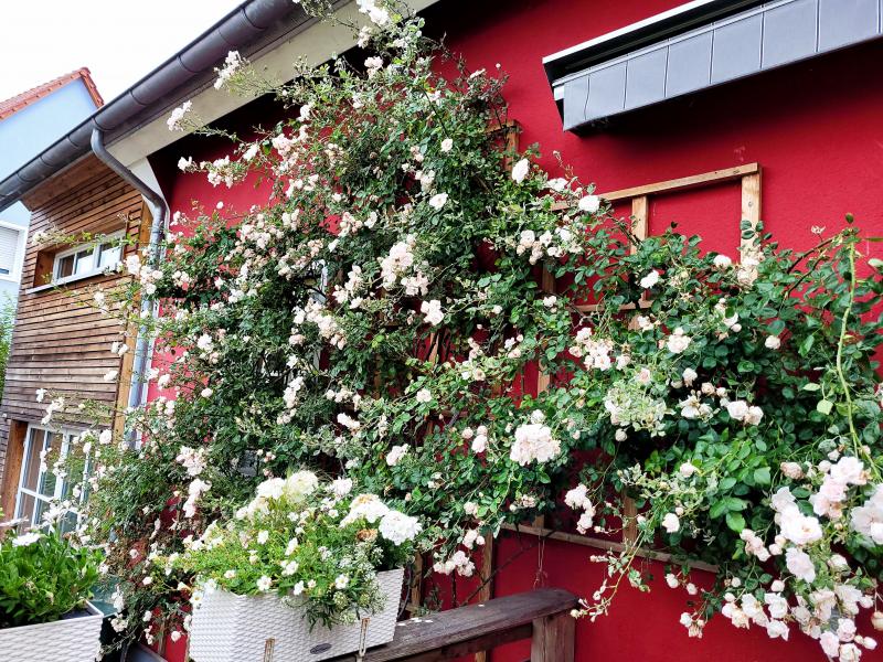 Ich hab endlich meine riesige New Dawn an der Hauswand geschnitten, zwei Stunden auf der Leiter ::). Bin froh, dass ich jetzt damit durch bin. Außerdem mit GG meinen großem Pflanztisch aus dem Keller geholt, überdacht in der Holzlege aufgestellt und wieder meinen Sommer-Arbeitsplatz eingerichtet :D. Heute kann ich leider gar nichts machen - es geht ein starker, eisiger Wind. Kein Gartenwetter.