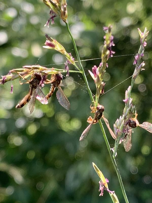 Neben vielen lebenden hängen an diesem Blütenhalm mind. 5 Tote. Welche Spinne oder Tier macht denn sowas ? Zumindest erkennt man dort Spinnenfäden. So etwas habe ich bei anderen Gräsern noch nicht beobachten können zumnindest nicht in der Anzahl und Frequenz weil von meinen 3 Dauerstrahl sehen fast alle Blütenhalme so aus