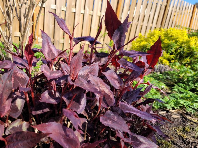 Hoffentlich nicht mehr durch Spätfröste gefährdet treibt Persicaria 'Red Dragon'. ;D