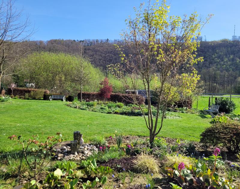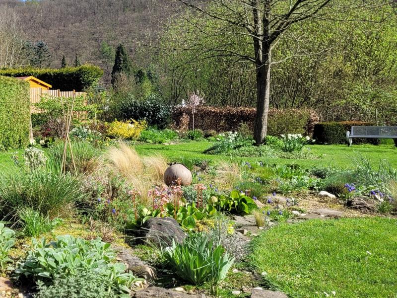 Wir sind im halbschattigen Terrassenbereich und schauen in Richtung Präriebeet. :D