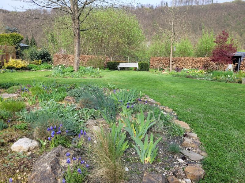 Hier haben meine Iris ihre Sonnenterrasse bekommen und danken es nun mit kräftigem Blattaustrieb. Trotz des ständig feuchten Winters mit heftigsten Regengüssen, denn das Gelände hat ja nach hinten ein leichtes Gefälle sodaß überschüssiges Wasser- im Idealfall :P - ablaufen kann.
