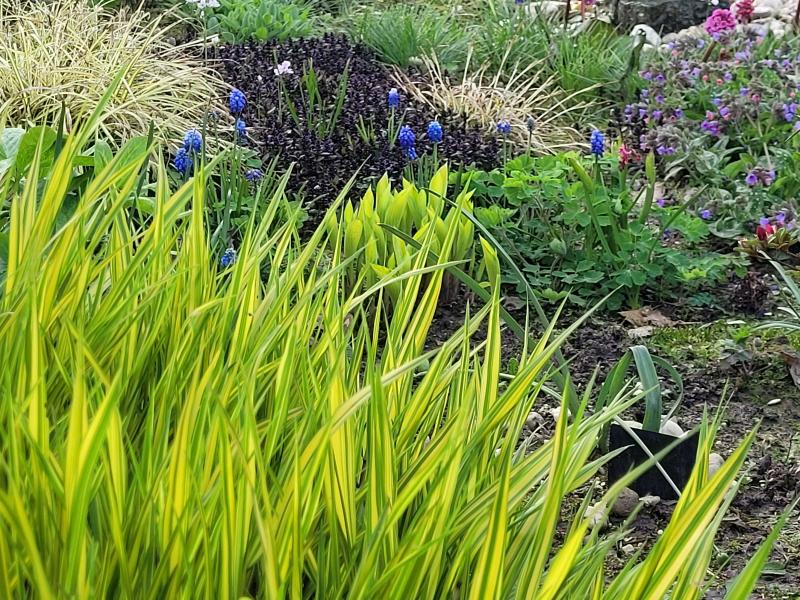 Hier haben meine Iris ihre Sonnenterrasse bekommen und danken es nun mit kräftigem Blattaustrieb. Trotz des ständig feuchten Winters mit heftigsten Regengüssen, denn das Gelände hat ja nach hinten ein leichtes Gefälle sodaß überschüssiges Wasser- im Idealfall :P - ablaufen kann.