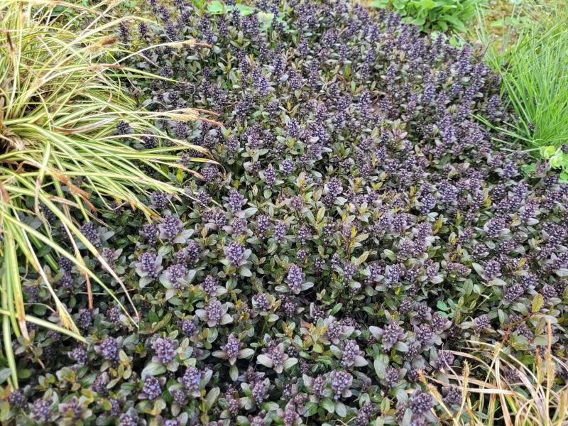 Der braune Bodendecker ist Ajuga tenorii 'Mauro', der Lanzengünsel. ??? ??? Blüht bald auch mit super blauen Kerzenblüten.