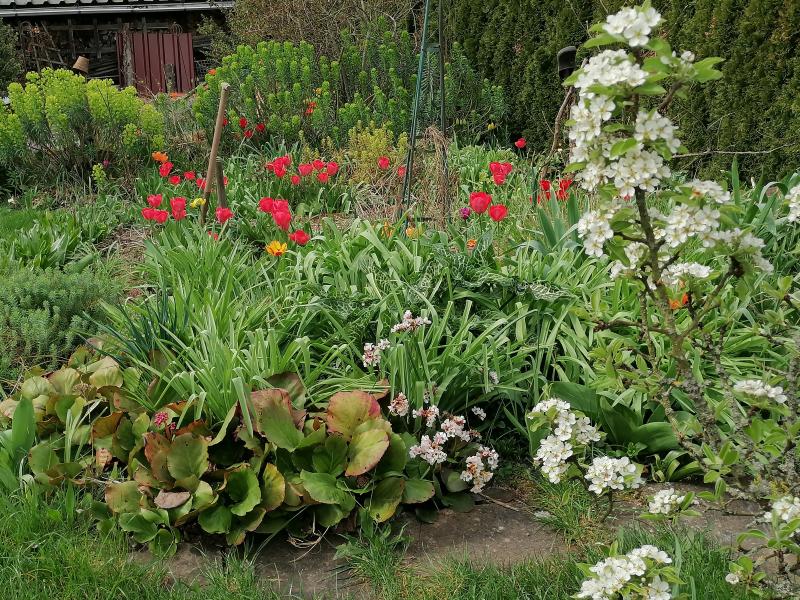 Hier gibt es schon sehr alte Exemplare noch von Vor- Vorbesitzern, dh mehr als 20 Jahren. Alles späte Tulpen, nicht besonders schön, wie zB diese roten. Sehr knallig, aber ich lasse sie gewähren, aus Respekt ;)
