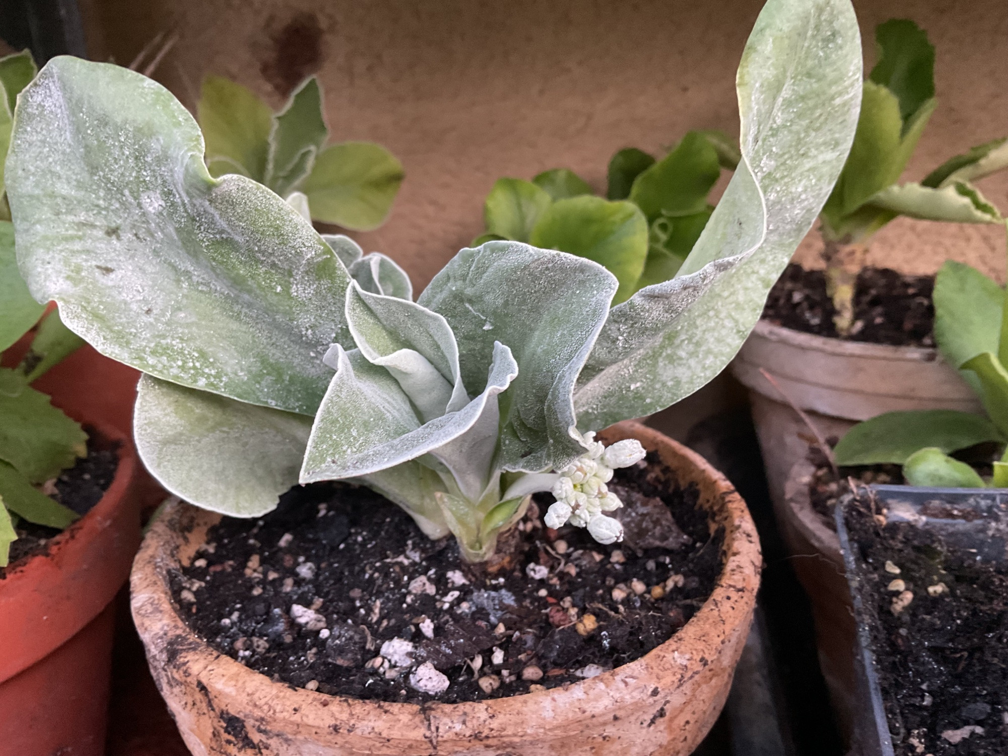Hier stehen die Aurikel auch in den Startlöchern. Die haben ja den Vorteil, dass man sie gut in Töpfen und damit in Etagen im Regal stapeln kann. Wenn sie dann blühen, kommen sie in schöne alte Tontöpfe und dahin, wo man sie gut sieht, auf den Tisch oder vor den Eingang oder vors Küchenfenster.