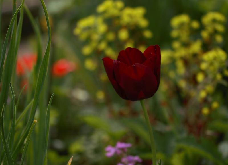 @Mediterraneus: die Tulpen sind sehr dunkel, aber nicht schwarz, und sehr robust, nur habe ich den Namen nicht parat. Auf dem Foto durchleuchtet sie die Sonne. Es stehen davon mehrere Gruppen.