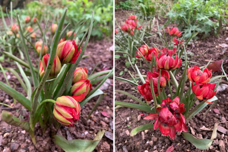 Meine Tulpen wuchsen im Kies. Davon habe ich auch schon Bilder in den letzten Jahren gepostet. Aber nun sind sie hinfort. Lediglich Wildtulpen, batalinii, clusiana, flavamirea halten sich dort. Und ein paar wackere "Flaming Purissima". Das war's dieses Jahr.