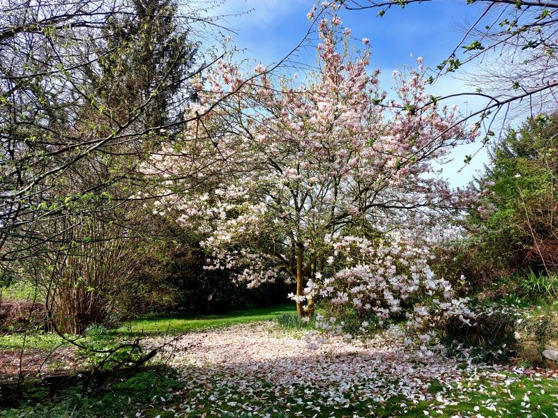 Bei uns gibt es heuer eine Magnolienblüte ohne Frost und ohne Regen - dafür ist es so warm, dass schon bald alles vorbei ist (momentan noch 18 Grad). Aber dieser Blätterteppich hat auch was....