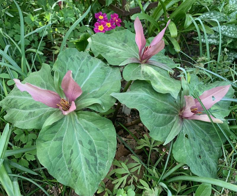 Ein letzte Hybride. Trillium grandiflorum lässt sich noch etwas Zeit mit der Blüte.