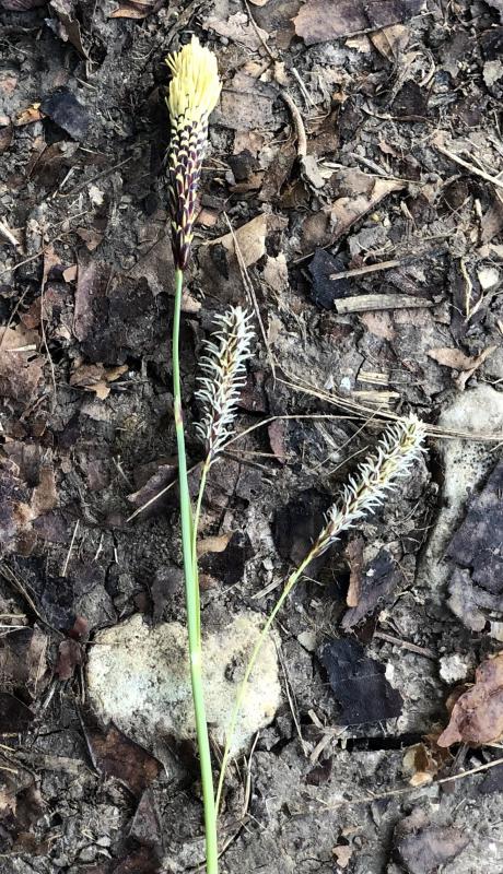 Wegen den langen Ährenstielen und dem Standort tippe ich auf die Blaugrüne Segge (Carex flacca). Ich bin aber nicht sicher. Das wäre auch so eine Art, die in Süddeutschland auf kalkreichen Trockenstandorten vorkommt, hier im Nordosten aber in wechselfeuchten Pfeifengras- und Kleinseggenwiesen wächst, ebenfalls auf kalkreichem Boden. (Vielleicht zeigt sie aber auch bei Euch an, wo im Untergrund mehr Wasser sichert sickert als man nach dem ersten Eindruck denken würde.)