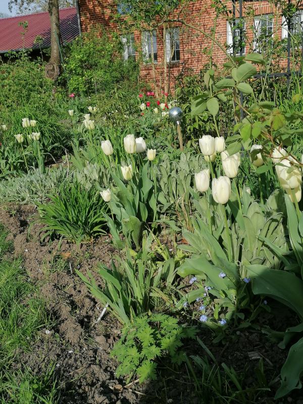 Die grossblütigen Tulpen sind hier mehr oder weniger durch. Heut war 4. oder 5. Sommertag diesen Monat mit nochmal 27°. Da kann man Frühbühern stundenweise zusehen wie sie vergehen. Selbst die späten T. b. Lilac Wonder sind schon voll offen. Denen gefällts unter Osmanthus wo sie sich immer weiter verbreiten.
