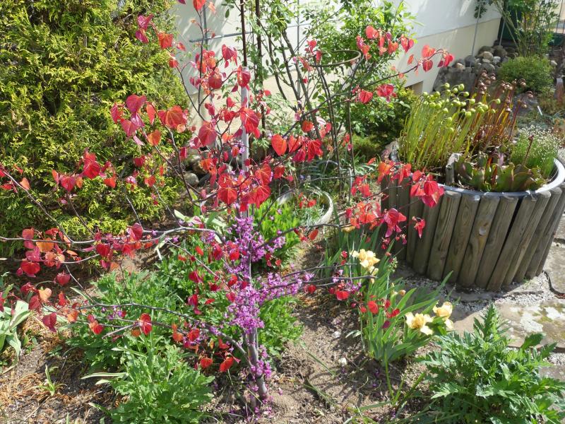 Cercis canadensis ‚Vanilla Twist‘ steht hier noch im Topf, blüht der Jugend geschuldet noch zaghaft, aber immerhin tut er‘s.
