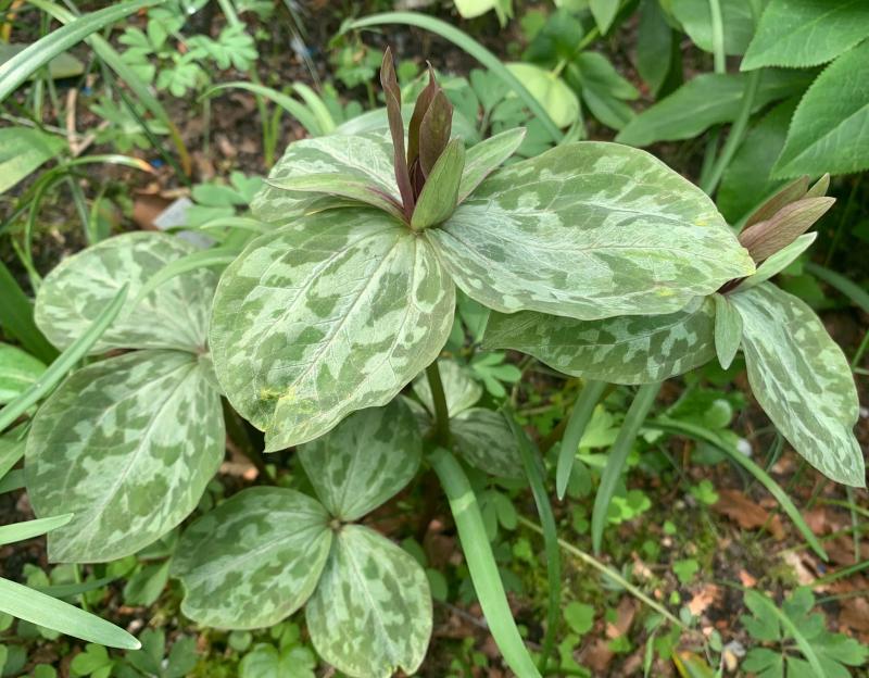Trillium cuneatum mit einer verwaschen Blütenfarbe. Dafür sind die Blätter schön gemustert.