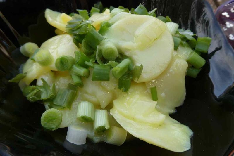 Heute Abend ausnahmseise nur kalt, da im Garten: Wieder Debreziner und Kartoffelsalat , zum Kulmbacher Kellerbier.