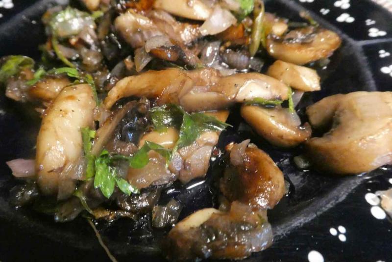 Die Schwammerl bewährt spanisch mit Zwiebeln und Butter gebraten und mit weißem Balsamico abgelöscht.