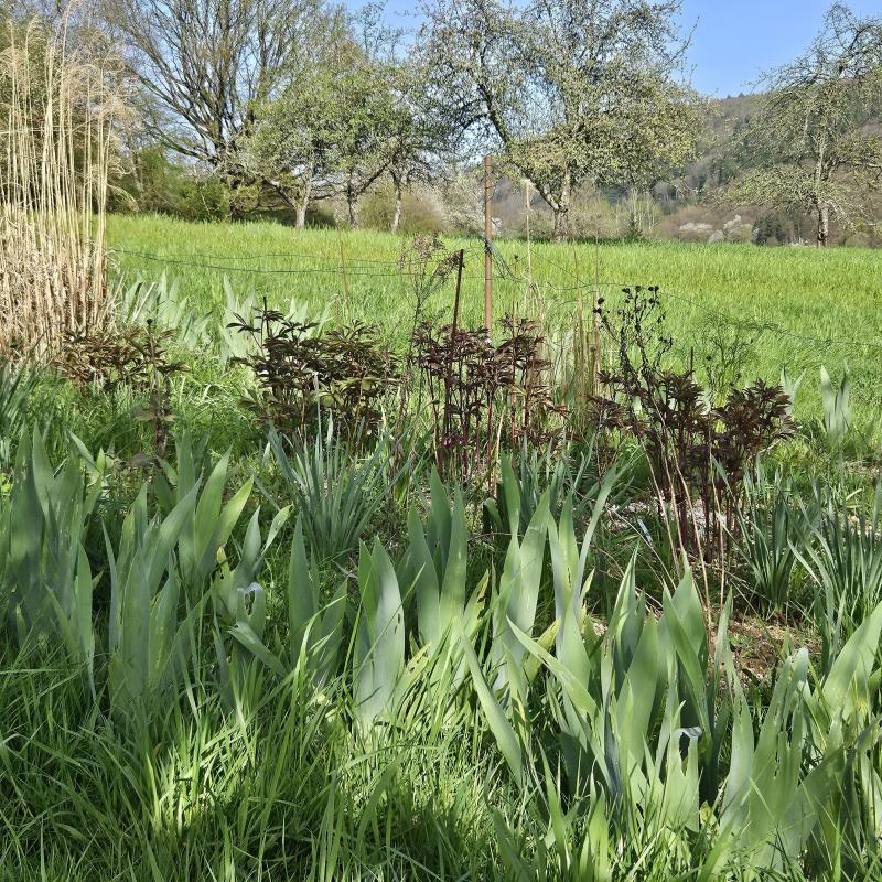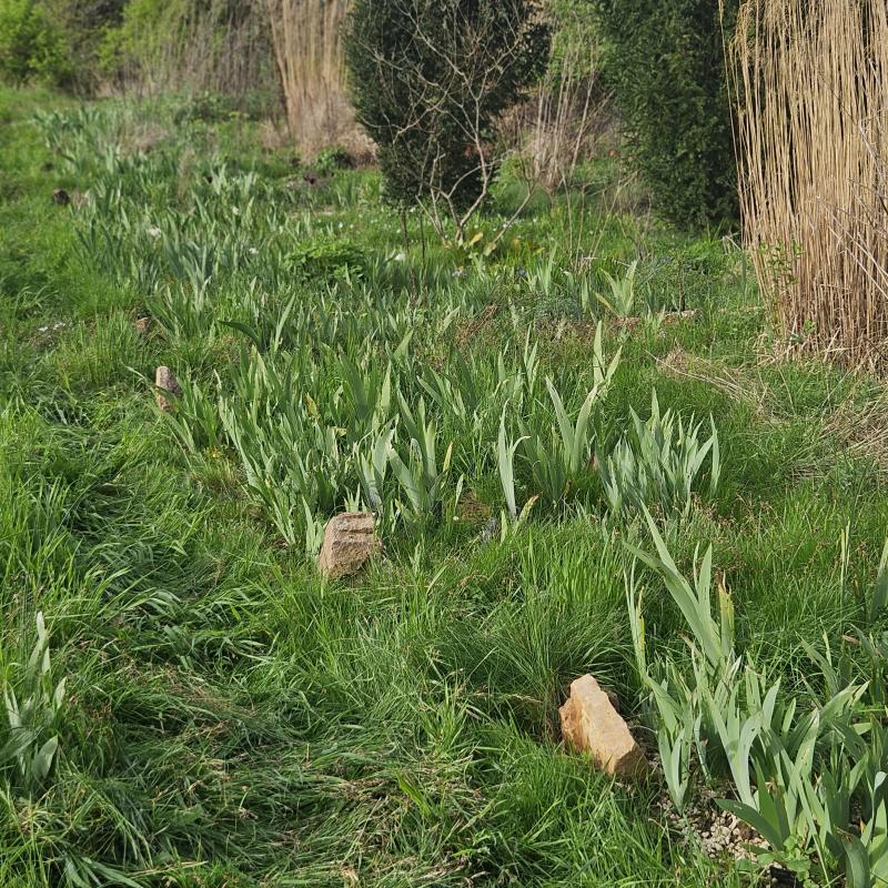 jetzt ist alles zurückgeschnitten und gemäht. Das Gras an den Rändern um die Iris ist geschnitten, ein bisschen gejätet ohne Knospen abzubrechen. Zwischen den Iris lasse ich alles stehen bis nach der Blüte. Das klappt.