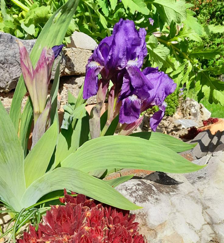 Hier blüht eine unbekannte Iris. Wenn ich gekonnt hätte, hätte ich sie lieber etwas höher gepflanzt, so daß die Rhizome aus der Erde schauen. Ich hab sie leider nicht mehr zwischen den Steinen raus bekommen, aber anscheinend geht's auch so: