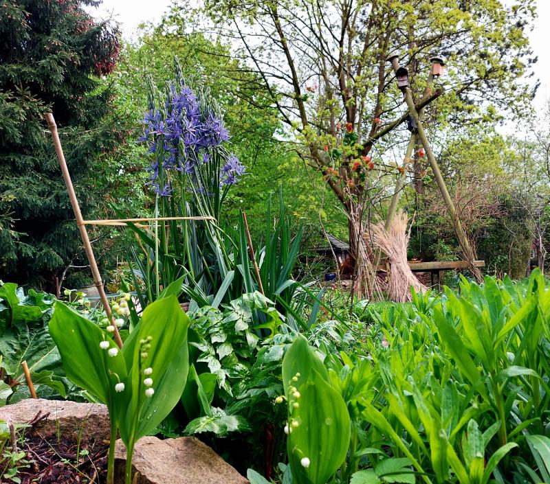 Aprilglöckchen, Camassia leichtlinii als blaues Fanal inmitten von emporstrebenden Grün.