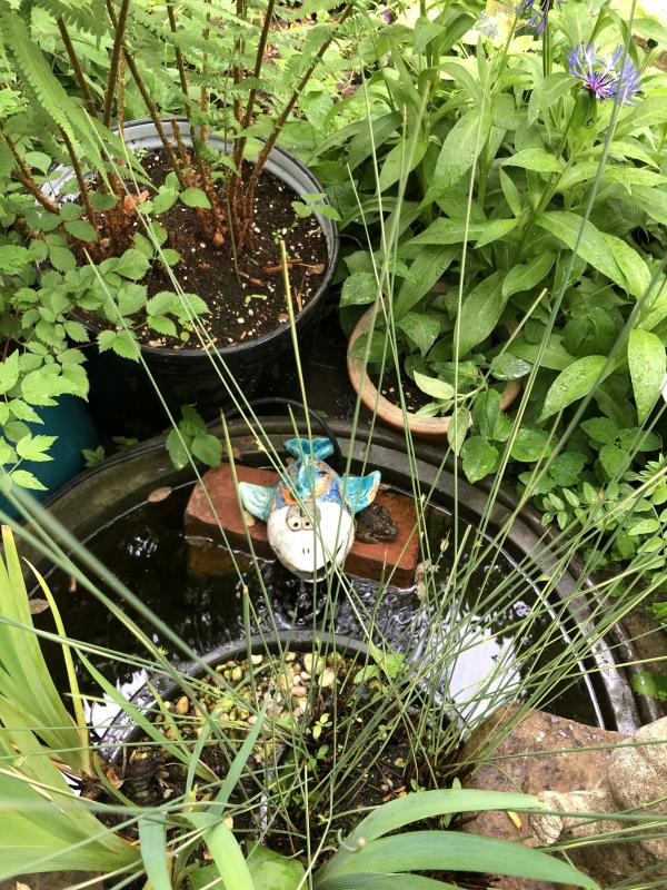 Und wenn wir nun schon beim Thema Miniteich sind - ich habe wieder einen Mitbewohner am "alten" Teich. Da mein Mann im vergangenen Jahr beim Mähen eine Kröte erwischt hat und ich im Frühjahr dann auch noch diese Ecke grundgesäubert und neu angelegt habe , hatte ich die Befürchtung, dass wir nun darauf verzichten müssen. Aber es ist wieder eine da, wie man auf dem Bild erkennen kann. Die ist sogar so unerschrocken, dass sie nicht vor mir flieht, solange ich die Ecke in Ruhe lasse. Sie sonnt sich einfach neben dem Fisch sitzend.