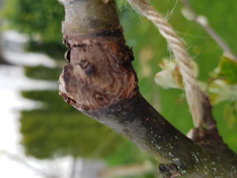Hier sieht es ähnlich aus. Oberhalb und unterhalb ist der Stamm in Ordnung und der Baum wächst und blüht seit zwei Jahren unbeirrt weiter.