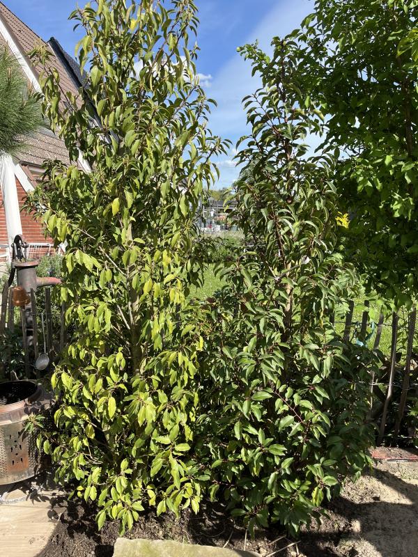 Und zwar habe ich Probleme mit einem portugiesischen Kirschlorbeer . Ich finde er sieht sehr blass grün bis gelb aus . Er wurde letztes Jahr gepflanzt . Direkt rechts daneben steht ein neuer aus der Baumschule . Auf dem Foto sieht man sehr schön den Unterschied in der Färbung . Er treibt aber diese Jahr auch aus und blüht auch . Was könnte es sein ?