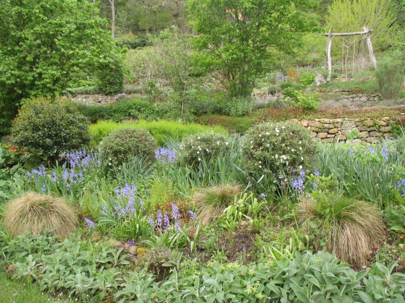 Das Hangbeet mit Hyacinthoides hispanica und Carex morowii 'Temnolepis'