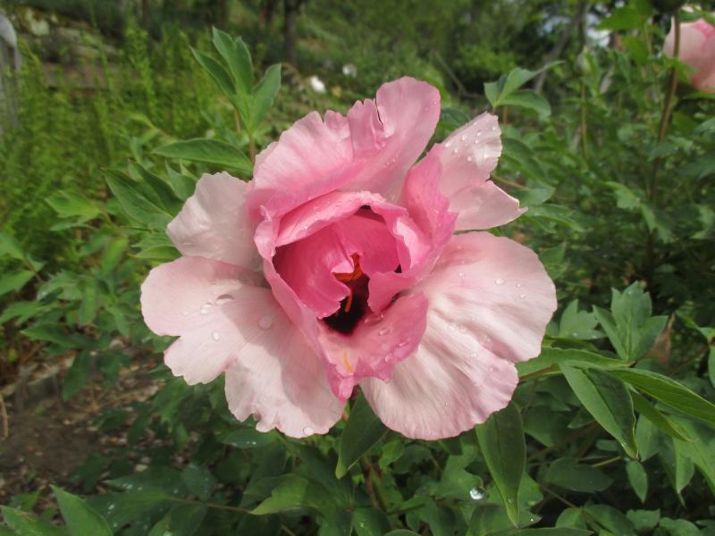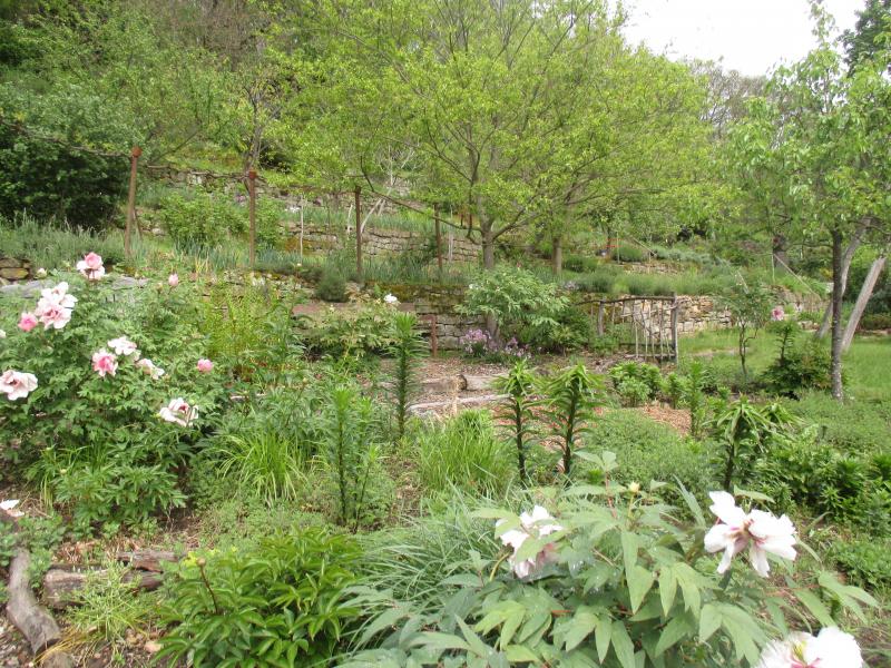 Vorne die frühe, jetzt verblühte Pfingstrose, im Hintergrund blüht eine andere gerade auf und die Lilien wollen wieder 2,50m hoch werden.