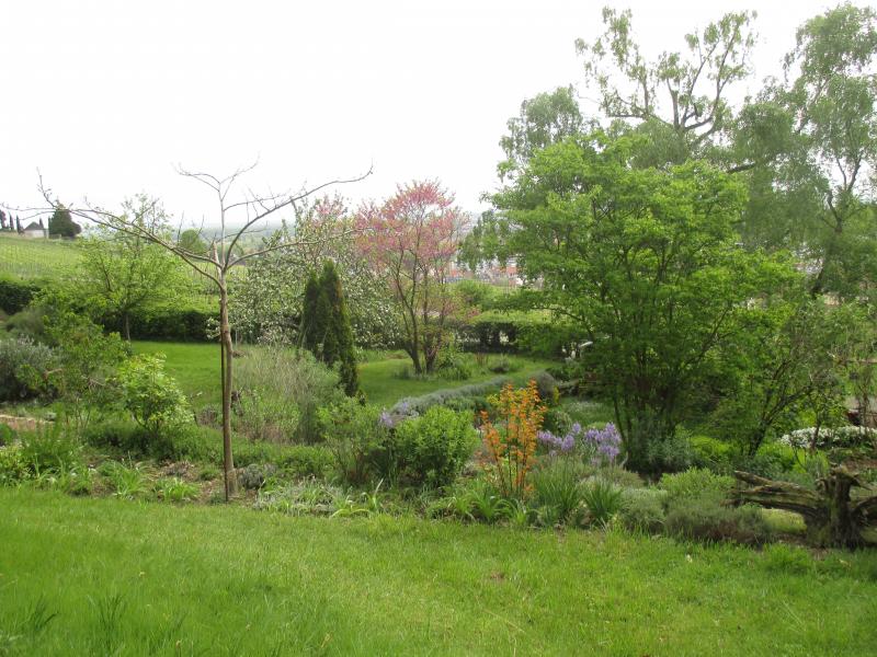 Links der Judasbaum, noch von meiner Mutter vor mehr als 30 Jahren gepflanzt, rechts der alte Gravensteiner über 100 und hohl.