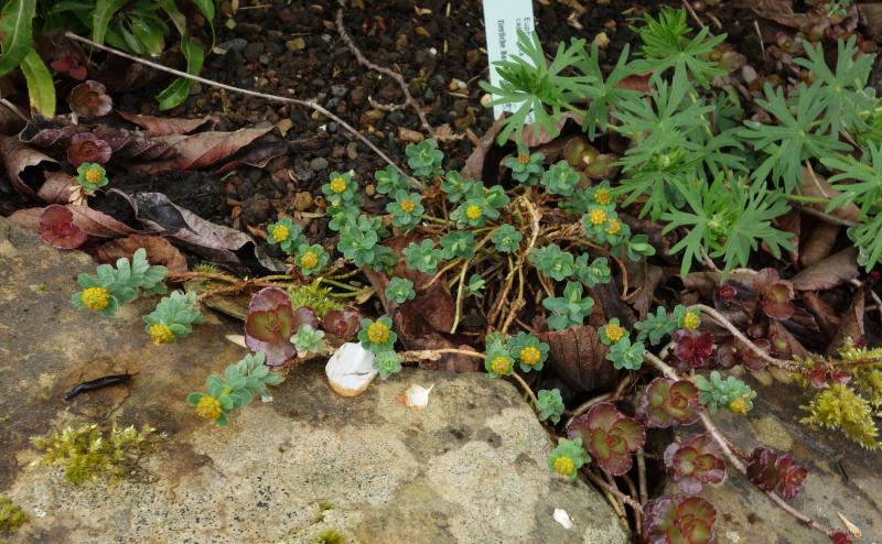 Letztere scheinen identisch zu sein, wenn man sich die Beschreibung von Hans Kramer zu 'April Glow' und Christian Kress zu der "echten" zwergigen Euphorbia fragifera durchliest. Beide rücken die Pflanze zwar in die Nähe von Euphorbia polychroma aber zumindest die 'April Glow', die ich aus Holland habe, zeigt für mich eindeutig alle Merkmale, die ich aus der Verwandschaft von E. palustris kenne,