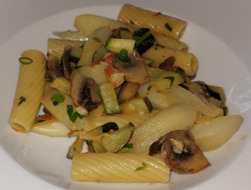 Rigatoni mit gebratenem Spargel, Champignons und Zucchini