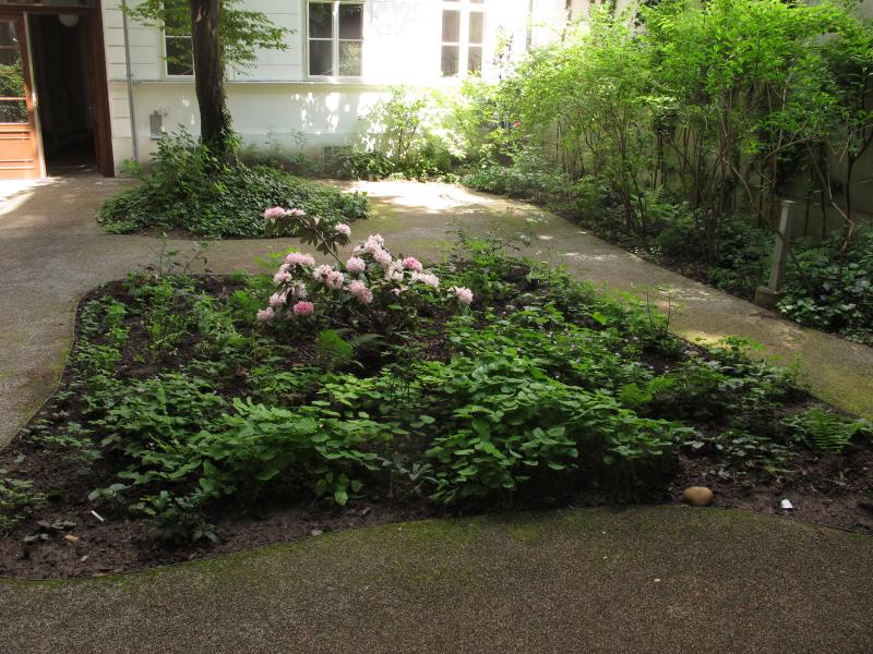 Der Standort ist tw. vollschattig, das Beet mit dem Rhodo bekommt nur im vorderen Bereich etwas Sonne - das war aber auch früher nicht viel anders. Die Bäume sind früher immer wieder geschnitten worden, inzwischen ist das aber eine Arbeit für einen keinen Kran (oder wie das Ding heißt) und so kostenintensiv, daß es die Hausverwaltung von Jahr zu Jahr verschiebt. Und in Wirklichkeit ist der Schatten im Sommer ein Segen in der Stadt, die Pflanzen (bzw. die Auswahl derselben) müssen sich eben danach richten ;)
