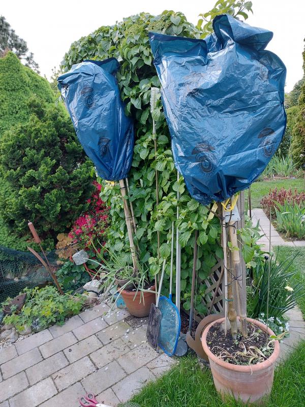 meine 3 kleinen Säulenäpfel hatte ich in Vlies gewickelt, eine kleine Strauchpfingstrose mit Bettwäsche abgedeckt, die größeren Pfingstrosen sind wohl hin, lassen alles hängen. Die Quitte ist noch in Knospe. Über ein kleines Hochbeet hatte ich Spannbetttücher gehängt. Die Töpfe, die unterm Dach standen sehen gut aus. Im GWH lief die Heizung.