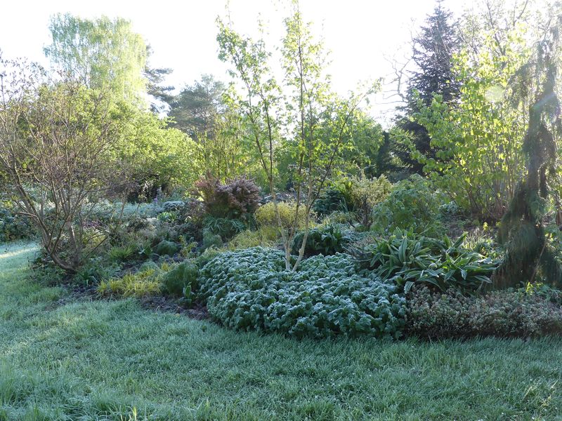 Das Umpflanzen dürfte beim Frost jetzt keine Rolle spielen, aber im neuen wie im alten Garten hat es halt die Magnolien und z. B. die Davidias ganz übel erwischt, den zerlegten Austrieb vom neu gepflanzten Rhododendron calophytum hatte ich ja schon im Spätfrostfaden gezeigt:
