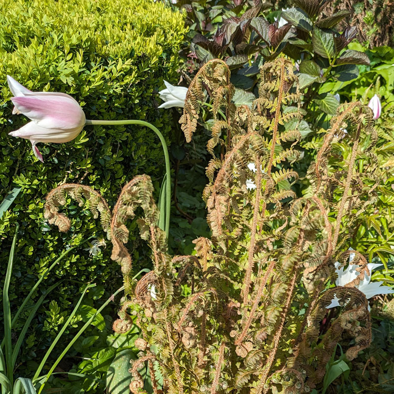 Eben war die Lage schon deutlicher: Bei den Farnen dürfte es so ziemlich alle erwischt haben. Die Athyrium sowieso, aber auch die Osmunda, Dryopteris und Polystichum. Viele Liliien stehen wieder stramm, einige hängen aber bogenförmig glasig in den Beeten (u. a. L. henryi).