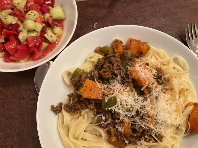 Hier gab es heute ganz normales Winteressen: faschiertes Hühnerbutterschnitzel mit Kohlrabigemüse und Petersilerdäpfln.