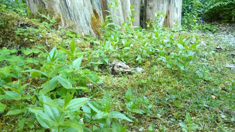Selbstaussaat von Schwalbenwurzenzian auf Splitwegen mit Moosbewuchs im zweiten Jahr.