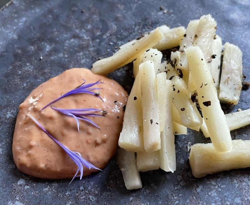 Die gegarten Löwenzahnwurzeln mit Marie Rose Sauce nach Ottolenghi. :)
