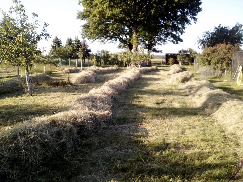In Abschnitten mähen wird empfohlen. Bei der Sensenmahd stellt sich die Frage von vornherein nicht, weil man sowieso immer nur Teilflächen schafft. Um Jungpflanzen habe ich Pferdemist auf der Baumscheibe, dort kommt das Gras sofort hin, sonst scharren Vögel alles weg und werfen es umher. Vor allem am Hang ein echtes Problem.